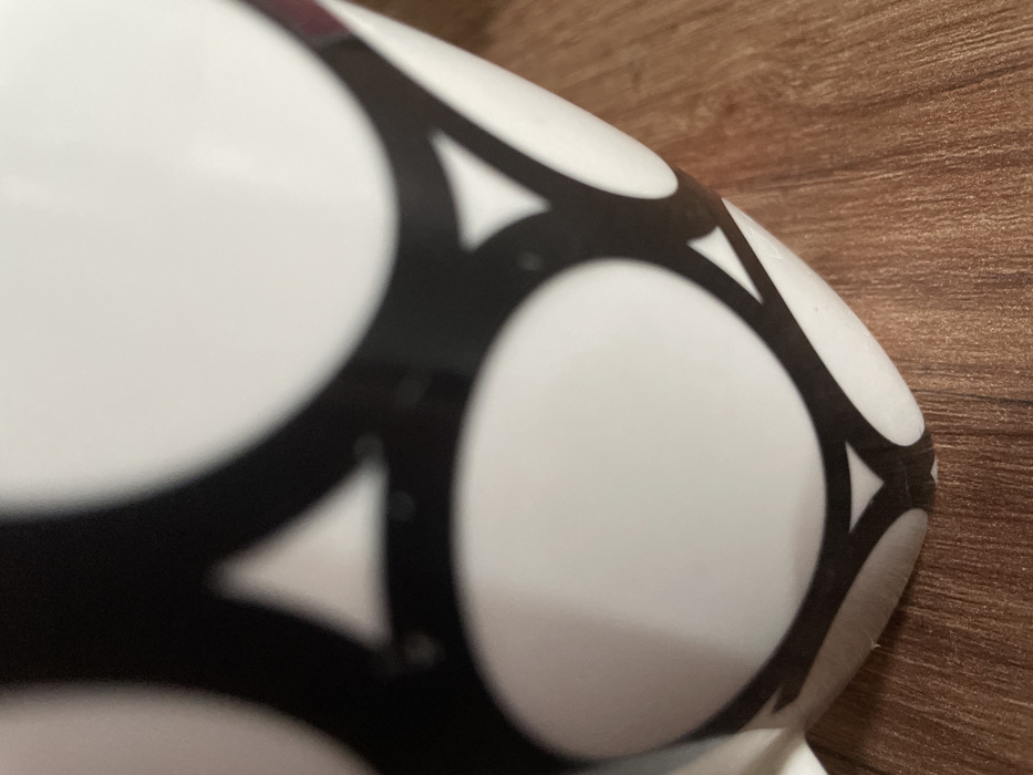 The image displays a close-up, slightly out-of-focus view of a white, curved object, likely a ceramic or porcelain vessel such as a mug or cup, featuring a prominent black geometric pattern