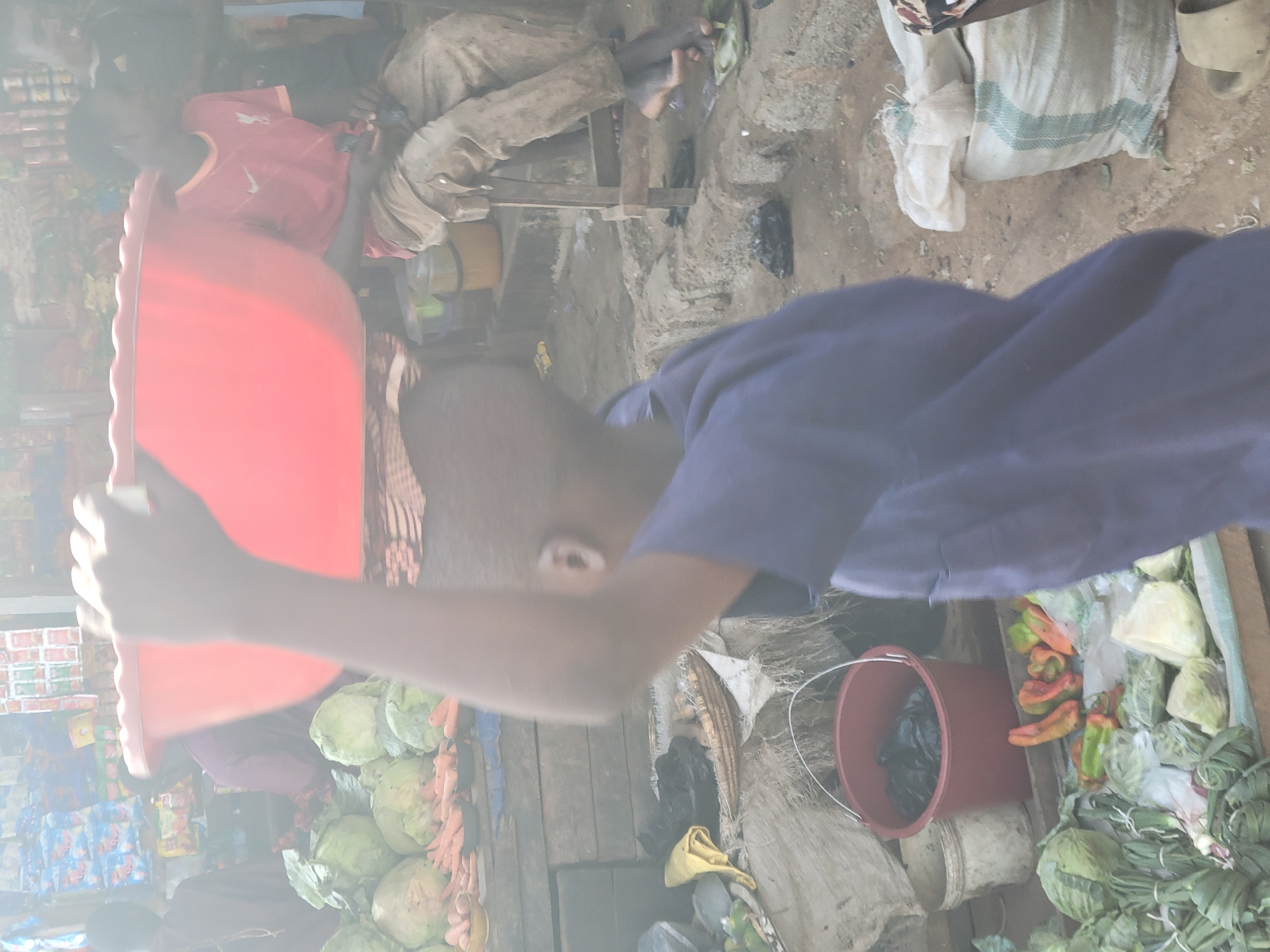 The image depicts a bustling market scene in Madalla, Nigeria. In the foreground, a person wearing a blue shirt stands near a table laden with various vegetables and produce. A red bucket is positioned on the table. To the left, a person in a red shirt is holding a large red container. The background reveals a wider market setting with other individuals and items scattered around, indicating a busy commercial environment.