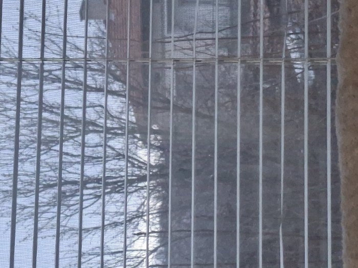 The image displays an outdoor scene observed from indoors, through horizontal window blinds and a fine mesh screen