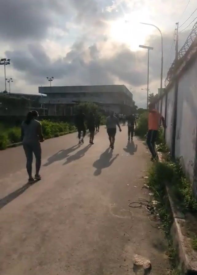 group of people walking and running on a road that appears to be near a walled compound or facility. The road is asphalt, with a concrete curb and patches of vegetation along the side. On the right side of the road, a tall wall topped with barbed wire extends into the distance. A man in an orange shirt is standing against the wall. The people are all dressed in casual clothing. Several of them are running away from the camera, their shadows stretching out in front of them in the direction of the sun. In the distance, a large building is visible beyond a fence and more vegetation. As the camera continues, a man in a red and black striped shirt and red shorts is seen standing near a large bush, and a woman walks to the gate of what appears to be the compound, briefly stopping to speak to someone at the gate. The sky is cloudy with the sun breaking through in spots. The overall setting seems to be on the outskirts of an urban area.