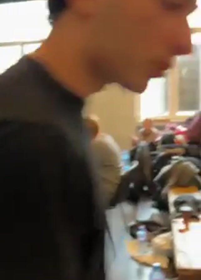 The video opens with a view of a room in a building. There are people standing and sitting in the room. There is a table near a window with a person sitting at it. The video then follows a person in a black shirt and black pants as they walk toward the group of people. The group appears to be rehearsing. There are several people in the shot. Some of the people are standing, some are kneeling, and one person is looking at a phone. The room has a black curtain along the back wall.