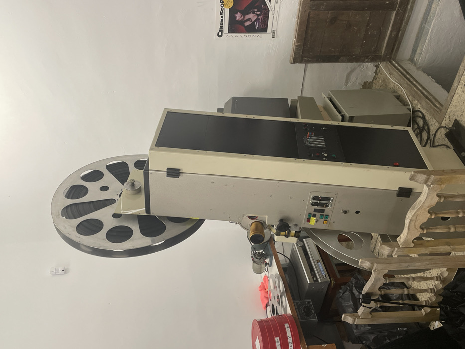 A vintage film projector with a large reel sits prominently in a room. A poster bearing the word "CinemaScope" adorns the wall above it. Nearby, there is a wooden door and a window, offering a glimpse of natural light. Electrical wires and boxes add to the vintage atmosphere, suggesting an older film processing environment.
