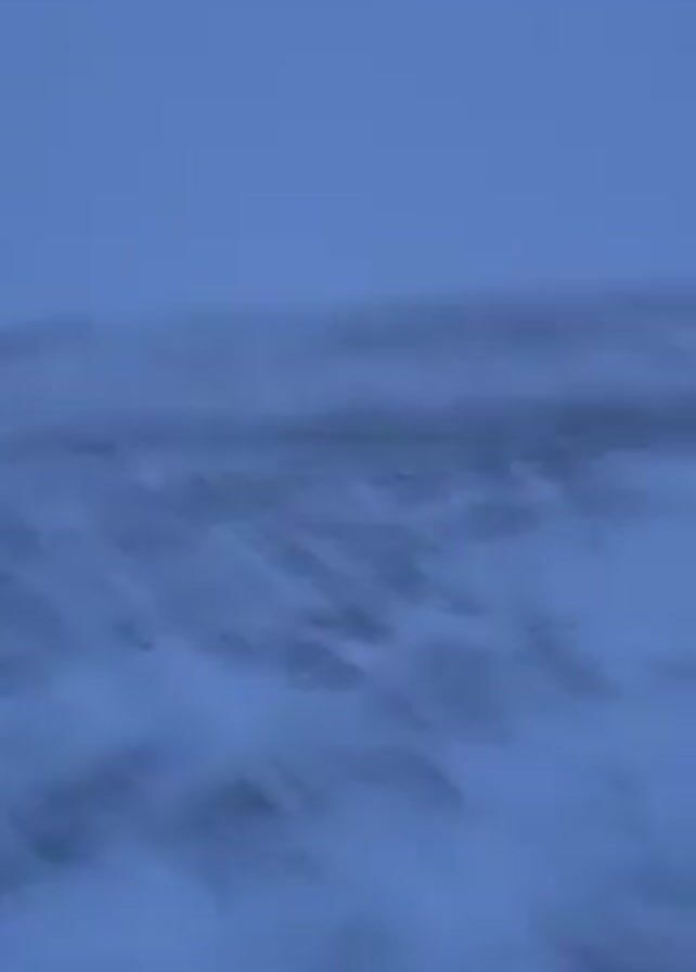snowy landscape under a blue, overcast sky. The ground is covered in snow with patches of dark vegetation visible. There is a small, blurry structure in the distance. The camera moves, creating a blurred effect.