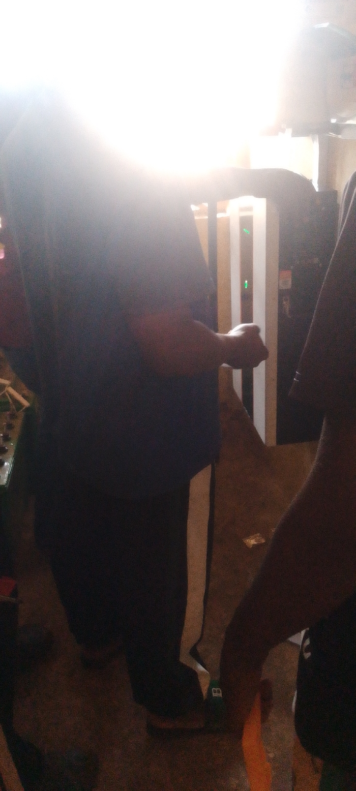 The image depicts an indoor scene, reportedly located in Ogbogbo, Nigeria, though the specific location within the city is not visually discernible from the image content. The scene is heavily overexposed by a bright light source originating from the upper left, obscuring many details. Two individuals are partially visible. On the left, a person, largely silhouetted, is seen from the chest down, wearing dark clothing including pants with a vertical white stripe on the outer leg. Their right arm is extended forward at elbow level, and their hand is balled into a fist or holding an indiscernible dark object. In the background, behind this individual, a vertical structure composed of alternating dark and light-colored panels is present. A small, bright green light or indicator is visible on one of these panels. To the far left, a surface with several small, dark objects, possibly electronic components or controls, is partially visible. On the right side of the frame, the lower arm and partial torso of a second individual are visible. This person's right hand appears to be holding a bright orange or yellow strip of material. The floor throughout the visible area is dark, appearing to be rough or unpaved, possibly dirt or concrete. No clear interactions between the two individuals are discernible.