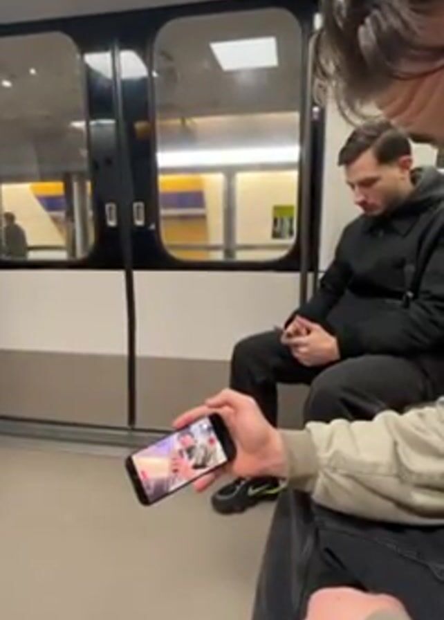 man sitting on a subway train, holding his phone and watching a video of a person applying makeup