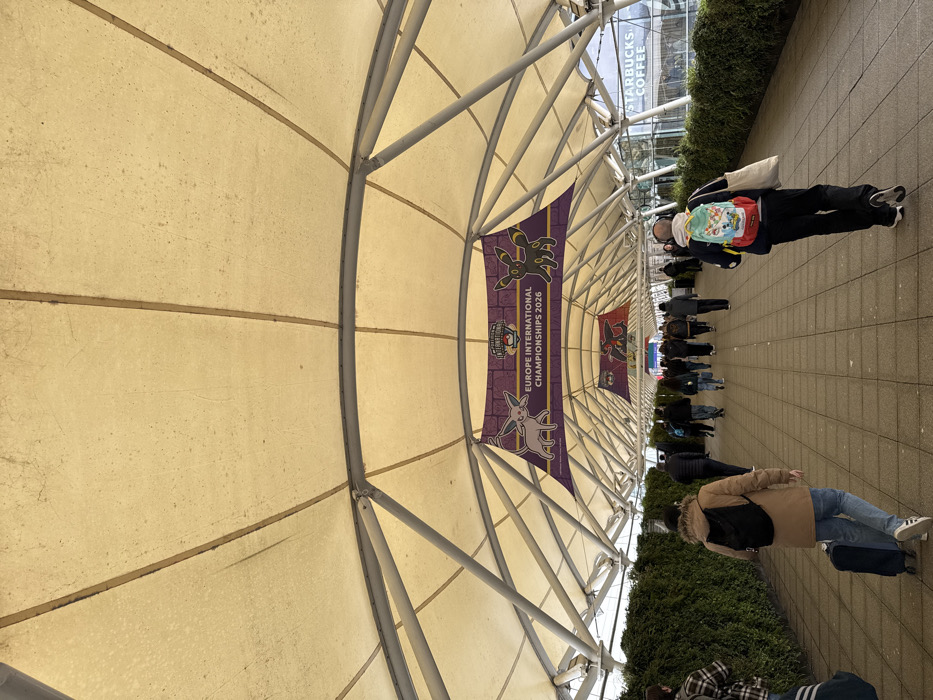 The image captures a covered pedestrian walkway at the ExCeL London Exhibition Centre, United Kingdom. The walkway is characterized by a high, arched canopy constructed from light-colored, possibly beige, fabric panels supported by a curvilinear grey metal truss structure. The ground is paved with rectangular light grey concrete or stone tiles. On the left side of the walkway, a dense, dark green hedge forms a continuous barrier. On the right side, a building with large glass exterior panels is visible, displaying a prominent "STARBUCKS COFFEE" sign. Multiple large, purple banners are suspended from the canopy's framework. The most prominent banner, positioned centrally, reads "POKÉMON INTERNATIONAL EUROPE INTERNATIONAL CHAMPIONSHIPS 2026" and features illustrations of two Pokémon characters, Espeon (light-colored) and Umbreon (dark-colored). Another similar banner is visible further down the walkway. Approximately fifteen to twenty individuals are present, primarily walking away from the camera, moving deeper into the covered structure. In the foreground-left, a person wearing a tan jacket, blue jeans, and a black backpack is pulling a dark blue wheeled luggage bag. In the foreground-right, a person from behind, dressed in dark clothing, wears a multi-colored backpack (possibly Pokémon-themed) and white over-ear headphones, carrying a white tote bag over their left shoulder. Other individuals in the mid-ground and background are also walking in the same general direction, wearing various casual attire and carrying bags. The lighting is even, suggesting an overcast sky or diffuse light filtering through the canopy.
