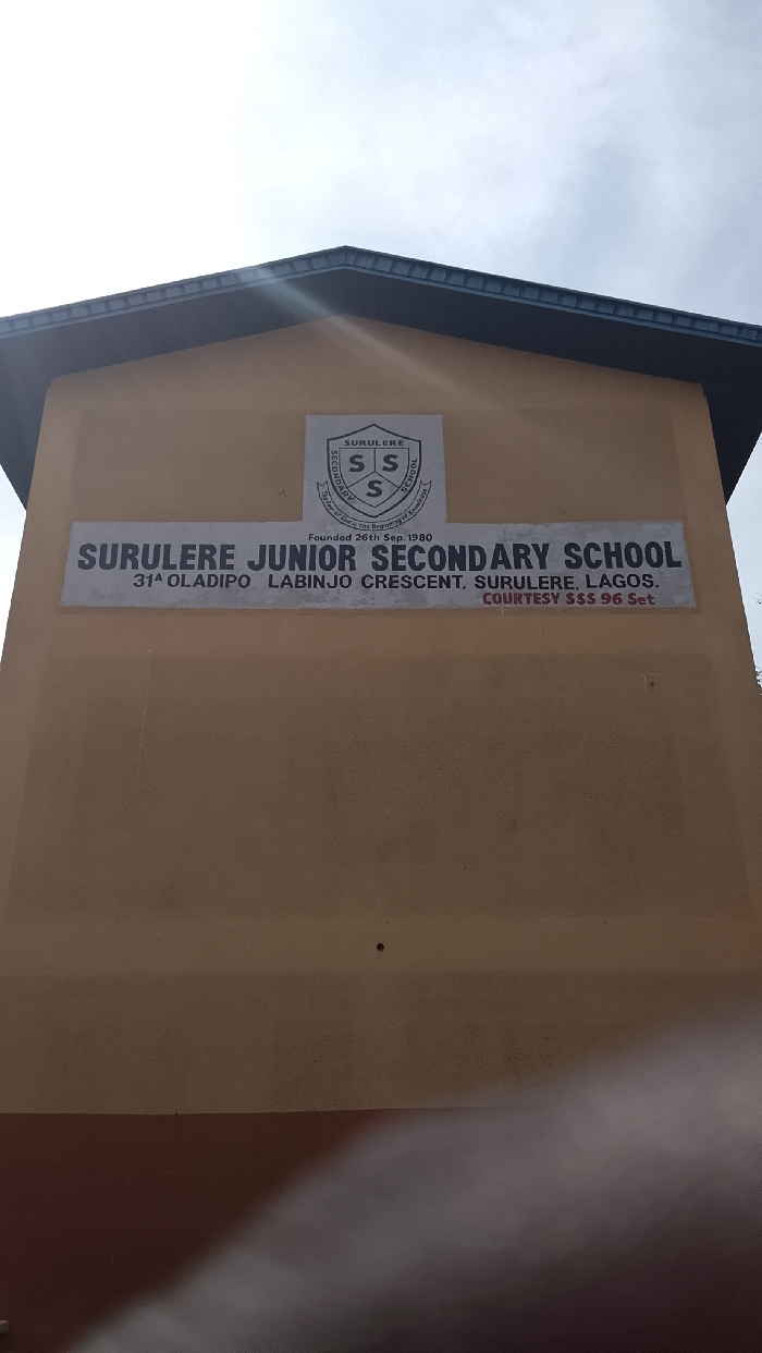 exterior wall of a building. The wall is tan, and the top of the building has a blue painted trim. The wall is marked with the sign for Surulere Junior Secondary School, which is located at 31 Oladipo Labinjo Crescent, Surulere, Lagos. The school was founded on September 26th, 1980. There is a small black dot near the top right corner of the building wall. The sign says "Courtesy SSS 96 Set." The location of the building, Surulere, Lagos, is at latitude 6.487 and longitude 3.36. The image appears to be taken on a bright, sunny day. The sun reflects off the building wall, creating a bright spot in the center of the image. There are no people present.