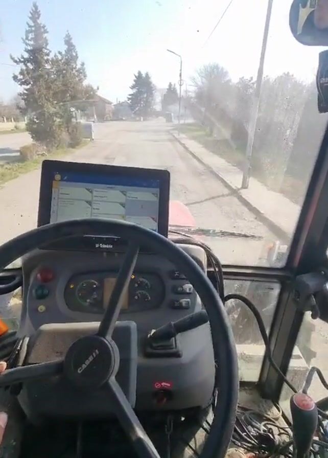 view from the inside of a Case IH tractor, looking out onto a rural road. The driver is visible in the rearview mirror. There is a Trimble tablet mounted on the dashboard, displaying a map. The tractor is moving forward on a sunny day. The road is lined with trees and houses, and there is smoke in the distance.