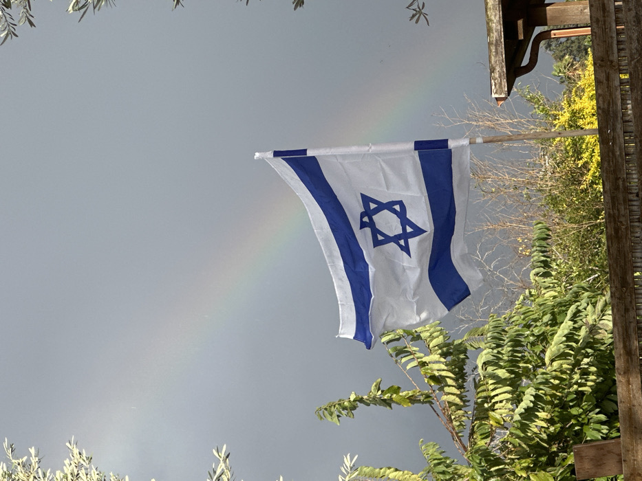 The image, taken in Beit Yitshak Sha'ar Hefer, Israel, displays an Israeli flag flying outdoors against a partially overcast sky featuring a rainbow