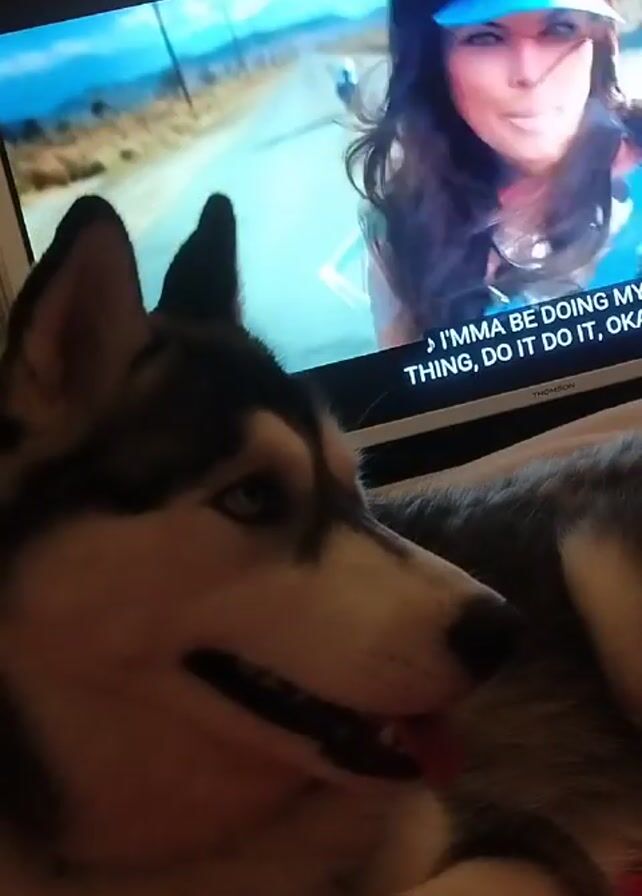 A husky rests its head on its front paws on a bed in front of a television. The television shows a music video with a woman singing and dancing. The husky pants with its tongue sticking out. The scene is well lit with some sunlight coming in. The text on the TV screen reads, "I'mma be doing my thing, do it do it, okay. I'mma I'mma this way".