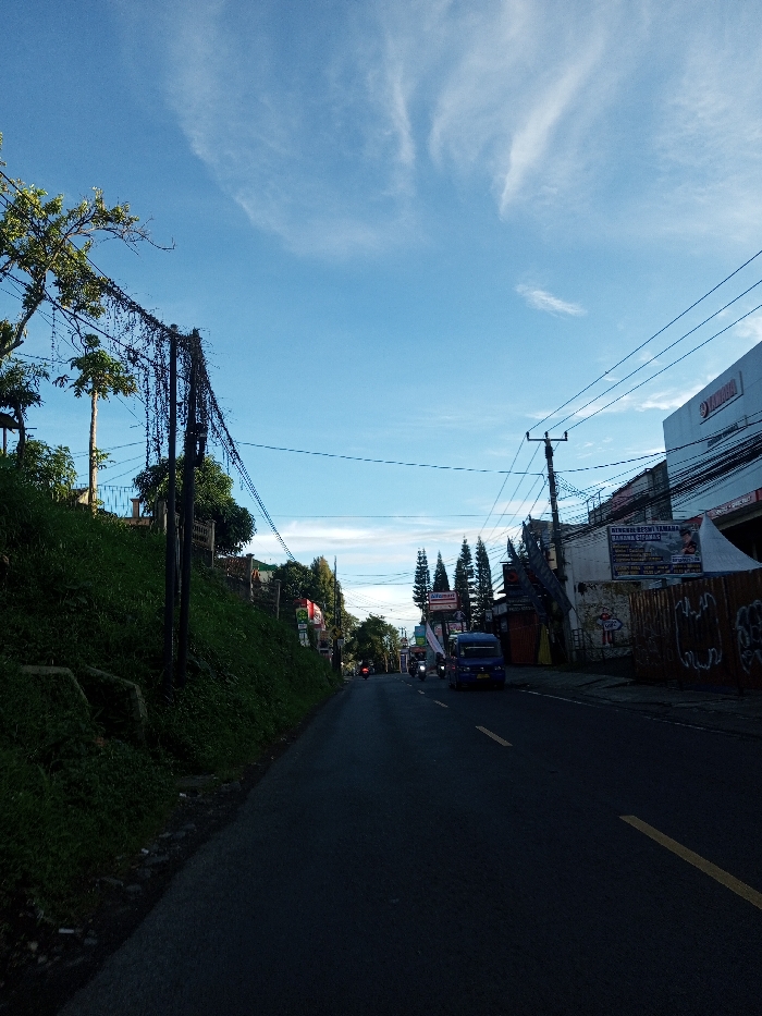 This image depicts a street scene in the city of Khouathineung, Laos, under a bright blue sky with sparse, wispy white clouds. The asphalt road, marked with a yellow double solid line, recedes into the distance. On the left, a steep, grass-covered embankment rises, featuring various trees and a utility pole heavily overgrown with dark vines. Power lines extend horizontally across the upper portion of the frame from this side. On the right side of the road, a series of commercial buildings are visible. One prominent building displays a "YAMAHA" sign, and further down, an "Indomaret" sign is identifiable. A banner with text, including "BANGUNAN RESTO TERJUAL RAHAYU CIFAMAS," is affixed to a building facade. Utility poles with multiple power lines line this side of the street. A blue minivan or small truck is present on the road, moving away from the viewer, and several motorcycles with riders are also observed further down the street. Conifer trees are visible beyond some of the buildings. The scene is illuminated by natural light, casting shadows that darken the foreground road.