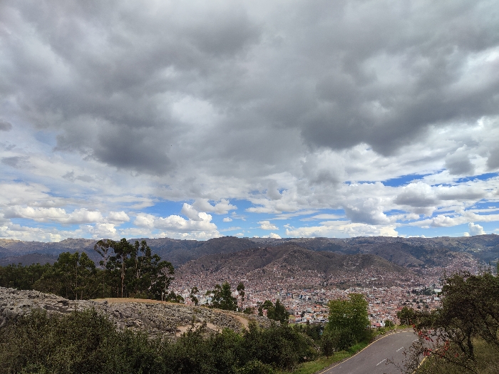 The image presents an elevated, wide-angle panoramic view overlooking the city of Cuzco, Peru, consistent with a vantage point from the Sacsayhuaman archaeological site or an adjacent hillside. In the immediate foreground, light-colored, irregular rock formations and exposed earth are interspersed with dense green shrubs and several tall eucalyptus trees featuring pale trunks. A two-lane asphalt road with a white dashed center line curves downwards from the mid-right towards the bottom right corner, bordered by trees and foliage. The midground is dominated by the sprawling urban environment of Cuzco, displaying a dense array of buildings with light-colored walls and ubiquitous reddish-brown tiled roofs, extending across the valley floor and ascending the surrounding mountainous terrain. The background consists of multiple rugged mountain ranges, exhibiting varied contours and sparse vegetation under a dynamic sky. The sky is largely covered by extensive, heavy grey cumulus clouds, with distinct patches of clear blue sky visible through breaks in the cloud cover, particularly towards the distant horizon. No individuals, animals, or specific vehicles are discernible.