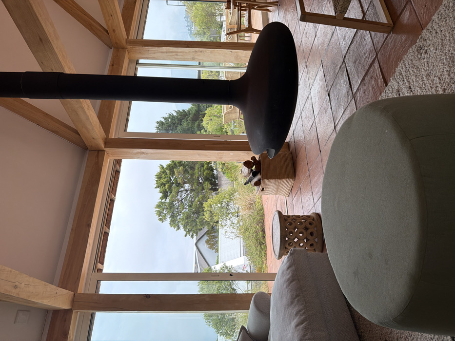 The image displays an interior living space located in Hout Bay, South Africa, characterized by a modern design with prominent light-toned wooden beams supporting a white ceiling. Large glass sliding doors frame an exterior view. The interior flooring consists of terracotta tiles, partially covered by a light-colored shag rug in the foreground. In the immediate foreground, a round, light green upholstered ottoman is positioned. To the left, a section of a light grey modular sofa is visible. A small, cylindrical wooden side table, featuring circular cutouts, stands on the terracotta tiles. To the right of the wooden table, a light-colored wicker basket containing cut firewood is placed on the floor. A central element is a black, elliptical-shaped suspended fireplace with a cylindrical flue extending upwards from the ceiling. Beyond the glass doors, an exterior patio area with terracotta tiles is visible. This area is bordered by varied green vegetation, including trees and shrubs. In the background, rooftops of other residential structures, one with a white corrugated iron roof and another with a dark pitched roof, are interspersed within the foliage. Further in the distance, hazy hills or mountains are visible under an overcast sky. Outdoor wicker furniture, including chairs and tables, is arranged on the patio to the far right. No individuals are present in the scene.
