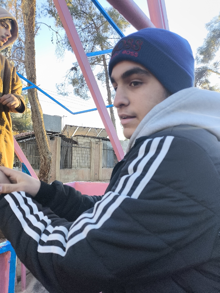 The image captures two young males outdoors in Jirud, Syria, under a clear blue sky. In the foreground, positioned to the right, a male with dark hair wears a navy blue beanie with a red "BOSS" logo, a light grey hooded sweatshirt, and a black quilted jacket featuring three white stripes down the sleeves. He is seated on a pink and blue playground structure, looking leftwards (viewer's right) with his mouth slightly ajar. His right hand rests on his leg. In the midground, to the left, another male is partially visible behind a tree trunk, wearing a tan hooded garment and appearing to adjust an item with his hands. The background includes sparse-leafed trees and additional pink and blue metal playground components. A light-colored building with dark barred windows is visible behind a dark metal fence. The building's roof supports multiple solar water heaters. Overhead utility wires are visible against the sky.