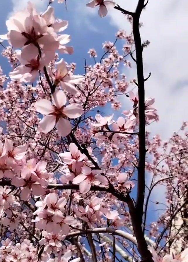 The camera looks upward through the branches of a tree filled with blooming, pink flowers against a backdrop of a partly cloudy, blue sky