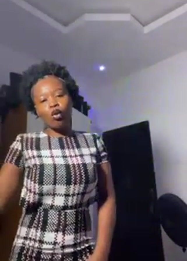 A young woman stands in a room and dances to music. She has dark skin and curly black hair, and wears a matching two-piece outfit in a black, white, and red plaid pattern. She is looking at the camera and moving her arms and body to the beat. Behind her is a closed black door, part of a closet, and a microphone stand. The room has white walls and ceiling. A blue light is visible in the ceiling fixture.
