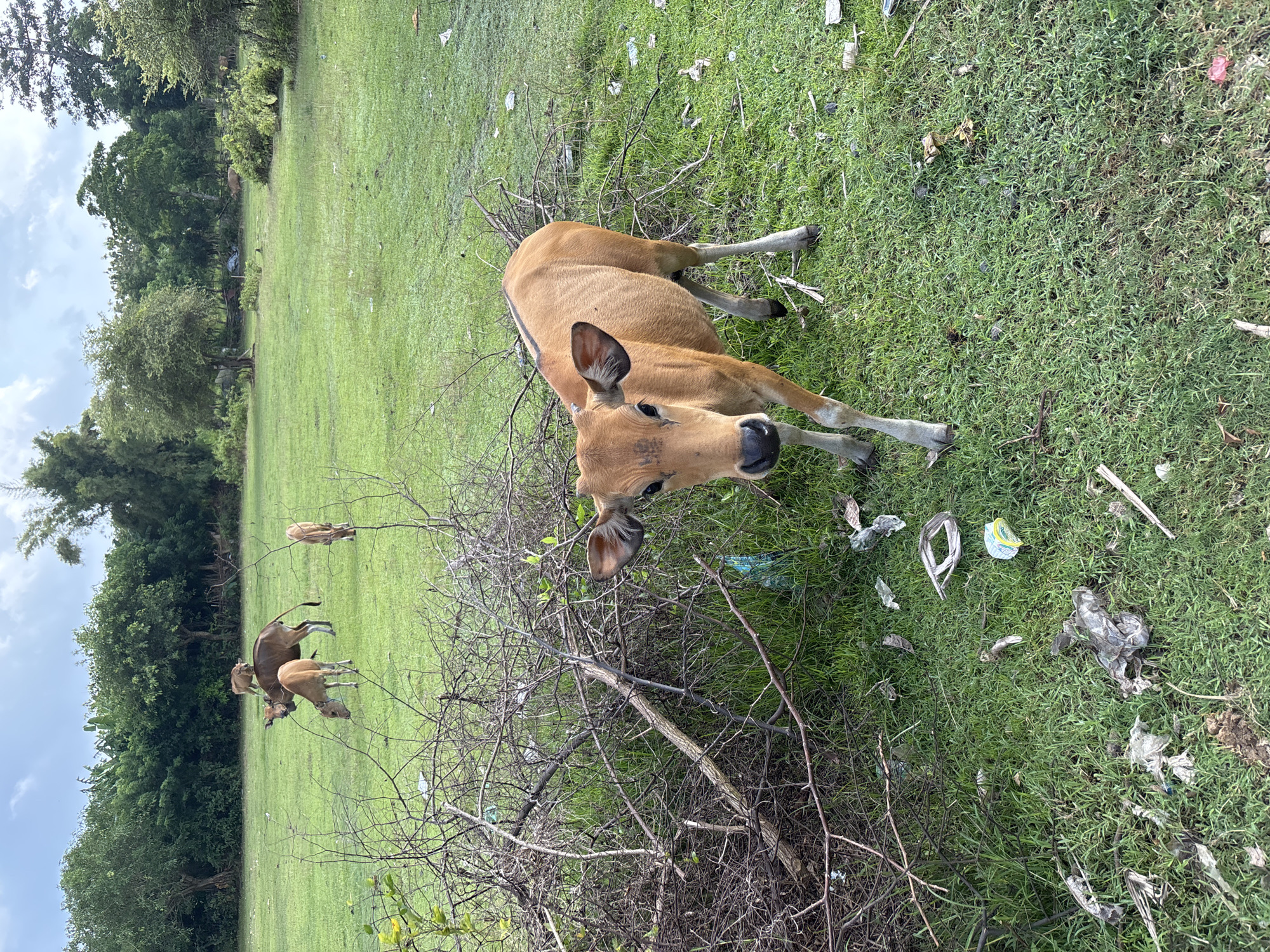 A light brown cow is reclining on the grass in a field located in Ungasan, Indonesia. The cow is positioned close to a pile of dry tree branches. Litter is scattered across the grass. In the background, there are three additional cows, trees, and a cloudy sky.