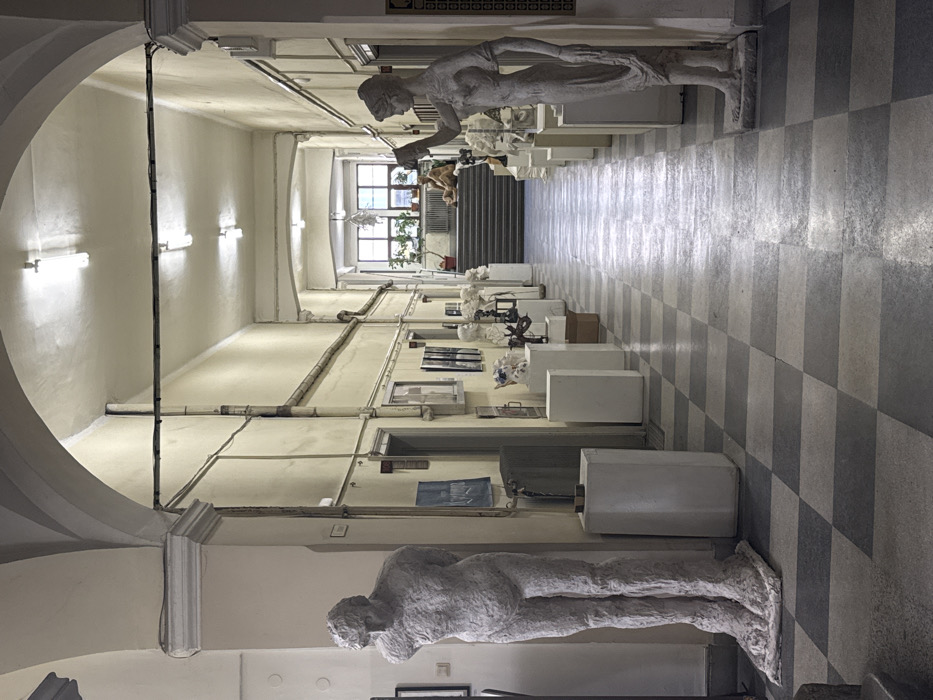 The image displays a long, institutional hallway functioning as a sculpture exhibition space within Veliko Tarnovo, Bulgaria