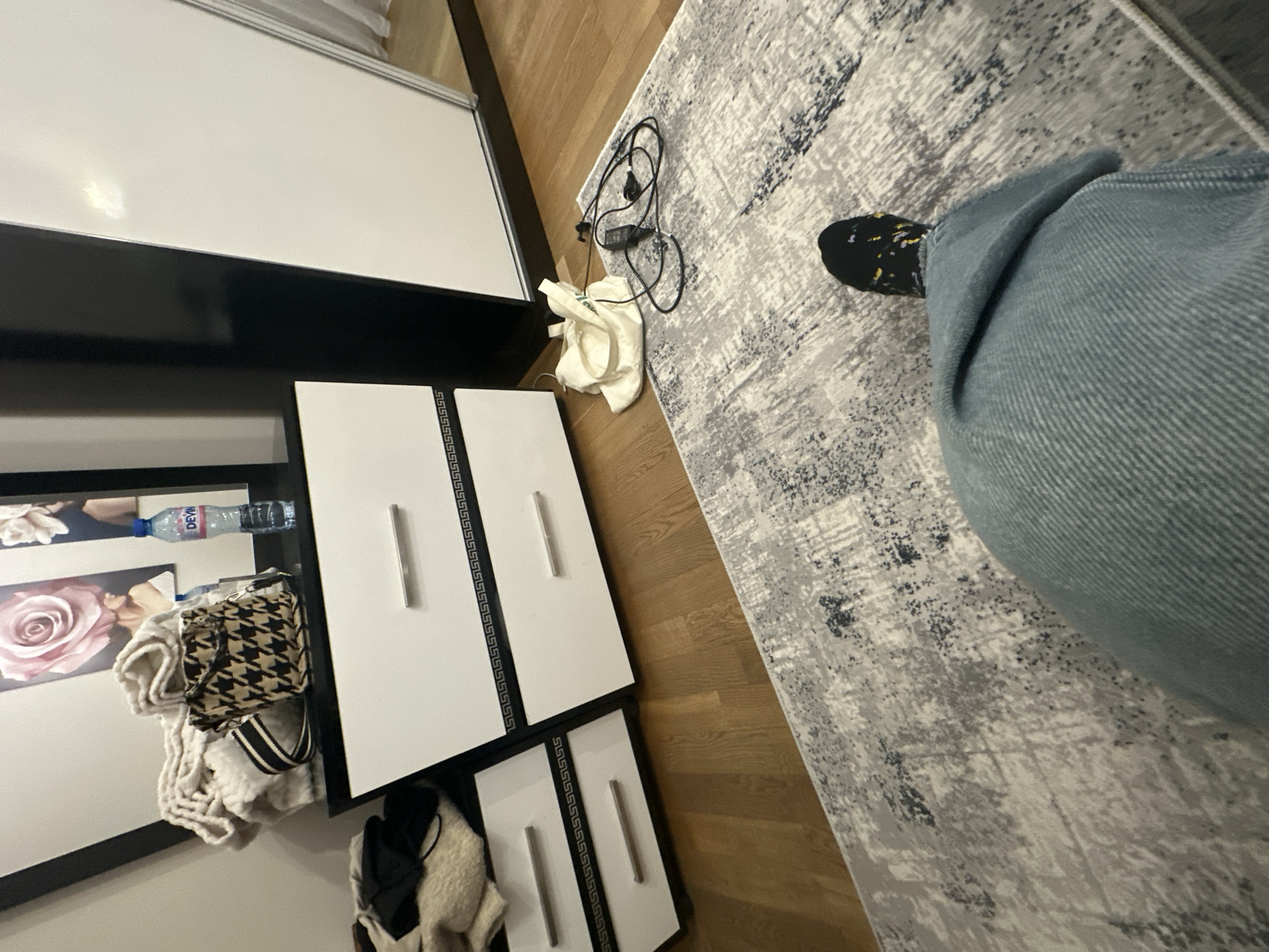 A high-angle, slightly tilted, indoor photograph depicts a section of a room in Lovech, Bulgaria. The room contains a light-colored, patterned rug with a person standing on it wearing blue jeans and black and yellow socks. Adjacent to the rug is a wooden floor. Alongside the wooden floor is a white cabinet with black trim and drawer pulls. On top of the cabinet are a white tote bag and a black power cord. The cabinet's surface holds a framed image of a rose, a water bottle, and a small, patterned purse. White clothing items are hanging in front of the cabinet drawers.