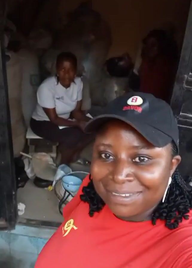 woman taking a selfie in front of a room, possibly a kitchen. The woman in the foreground wears a red shirt and a black baseball cap. She has dark curly hair and is smiling at the camera. In the background, another woman is sitting on a stool, seemingly occupied with an object in her hands. The room appears cluttered with various items, including bags, bowls, and cooking utensils. The lighting is somewhat dim, making it difficult to discern details.