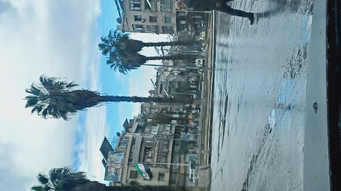 An urban scene features tall palm trees lining a street with multi-story buildings in the background. The architecture appears dated. A Syrian flag is visible. It's a wet day; the road is shiny, suggesting rain. A person walks across the street. The shot seems taken through a wet windshield or window, indicated by water streaks. The perspective is slightly tilted, adding to the sense of motion or instability.