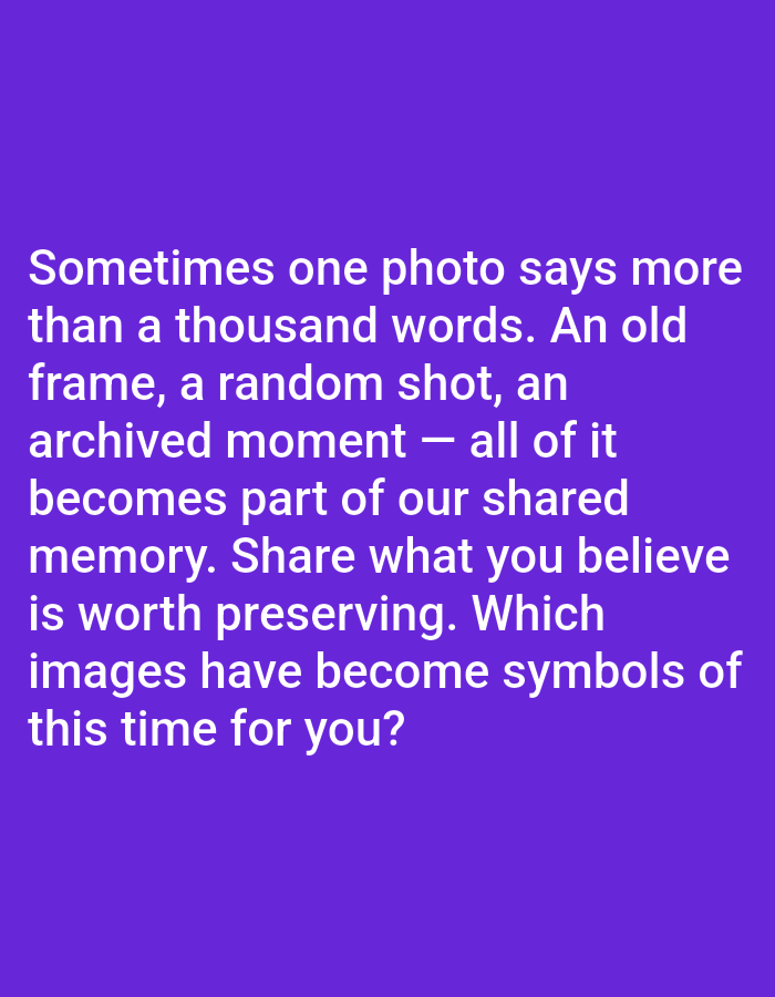 The image displays white sans-serif text against a solid purple background. This digital graphic is located in Yarun, Ukraine. The text, presented in multiple lines, reads: "Sometimes one photo says more than a thousand words. An old frame, a random shot, an archived moment — all of it becomes part of our shared memory. Share what you believe is worth preserving. Which images have become symbols of this time for you?" No people, physical objects, actions, or interactions are visually depicted within the graphic.