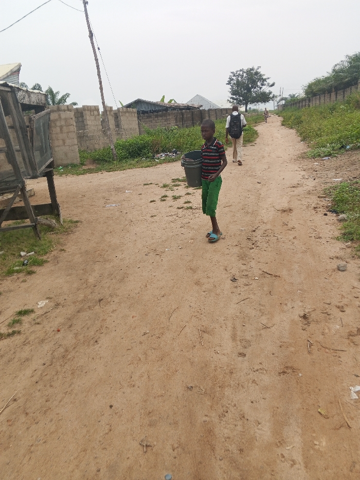 An image captured in Zango-ndaji, Nigeria, depicts an unpaved, light brown dirt road under an overcast sky. In the foreground, a young male, dark-skinned, wearing a horizontal striped t-shirt (red, black, white), green knee-length shorts, and light blue sandals, walks towards the viewer's left, holding a dark grey bucket in his right hand. To the immediate left, a weathered wooden structure with a mesh panel stands on the roadside. Further down the path, a person in light-colored clothing and a white backpack walks away from the camera. Beyond them, a second, less distinct individual is visible. The background features various structures including partially constructed cinder block walls, corrugated metal roofs, and lush green vegetation. A utility pole with wires leans on the left side, and a taller cinder block wall topped with foliage lines the right side of the path. A large green tree is present in the mid-ground on the right.