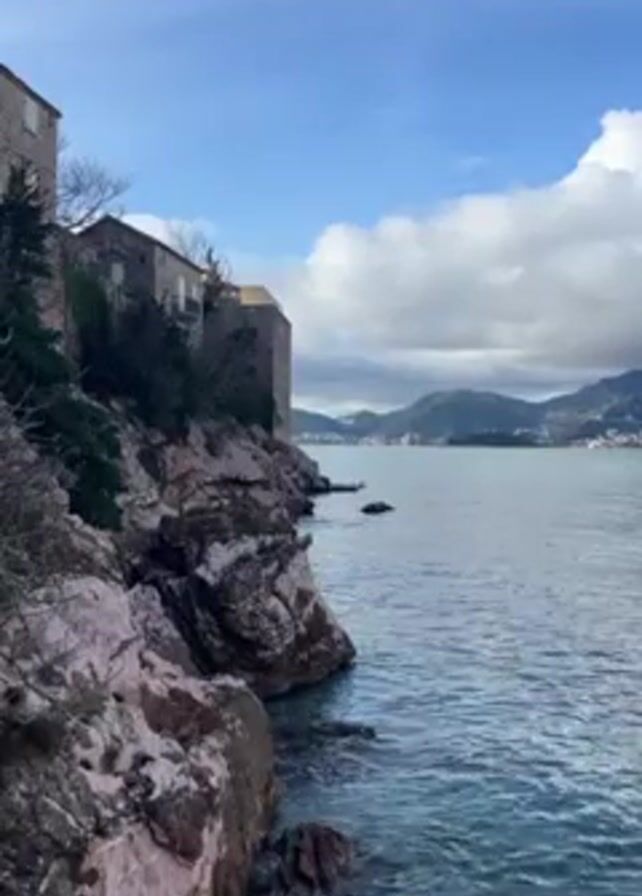rocky coastline with buildings on top of the cliffs and the ocean water extending towards distant mountains under a sky with scattered clouds. The camera is still, capturing a view of the stone buildings, the rugged rocks along the shore, and the gentle waves of the sea. The weather appears clear with a mix of sun and clouds, creating a bright yet slightly overcast atmosphere.