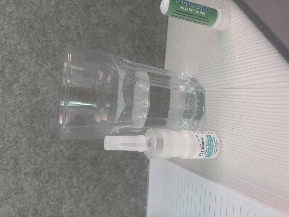 The image displays an indoor still life scene on a white, horizontally textured surface. A clear glass tumbler, approximately half-filled with clear liquid, occupies the center-right of the frame. To its immediate left stands a small, transparent plastic bottle of "Отривин Ментол" (Otrivin Menthol) nasal spray, featuring a white plastic pump nozzle and Cyrillic labeling indicating "спрей за нос" (nose spray) and "дозатор" (dispenser). To the right of the glass, a small, green and white cylindrical "Fresh Stick" nasal inhaler is present, also labeled in Cyrillic as "ИНХАЛЕР ЗА НОС" (Inhaler for Nose). A portion of a white notebook with horizontal blue lines is visible on the far left edge of the frame. The background consists of a uniform grey, subtly textured surface, likely a wall or partition. No individuals, direct actions, or interactions are depicted. Based on the Bulgarian language present on the product labels, the scene is located in Sofia, Bulgaria.