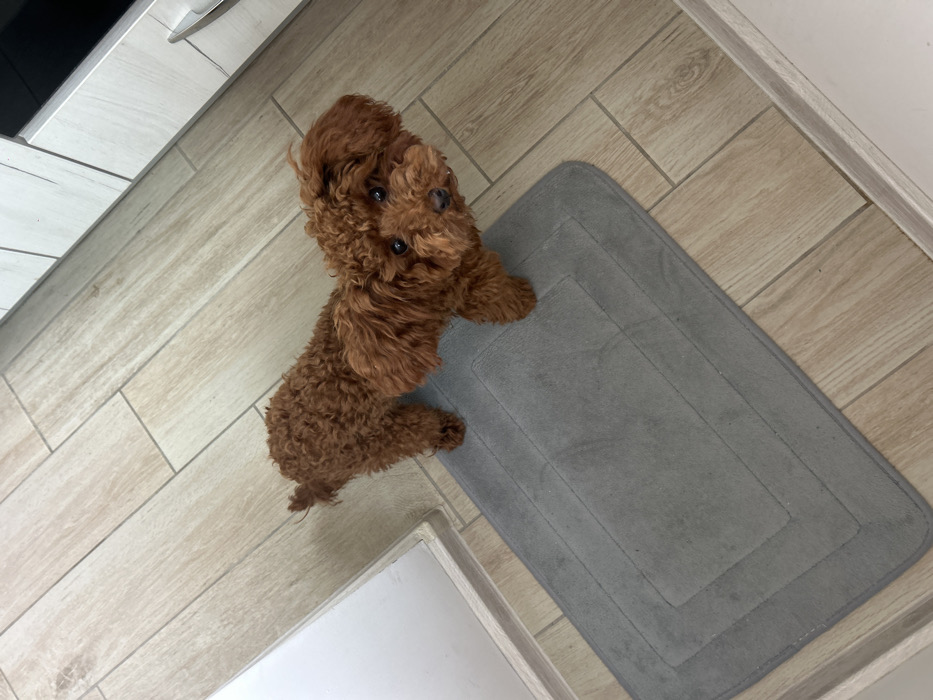 A small, reddish-brown dog, consistent with a Poodle breed, stands in an indoor domestic environment