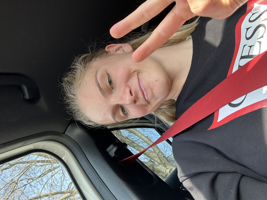 The image depicts a young female inside a vehicle, captured in a selfie perspective