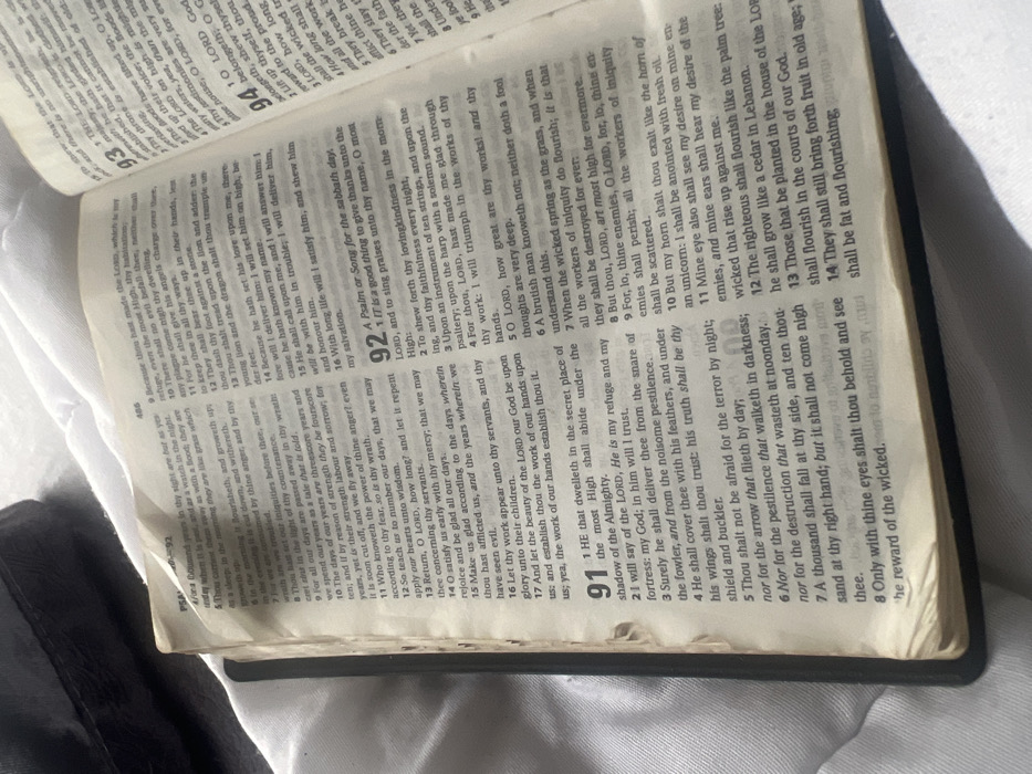 An open, aged Bible is positioned on a light-colored, textured fabric surface in Rumuofa, Nigeria. The book displays pages containing Psalms 91, 92, and the beginning of Psalm 93, with page number 486 visible on the left page. The pages show minor wear and creasing, particularly along the upper-left corner and the spine area. Natural light illuminates the scene from the left, casting soft shadows. A dark, out-of-focus object is partially visible in the upper-left background of the frame. No people or active interactions are depicted.