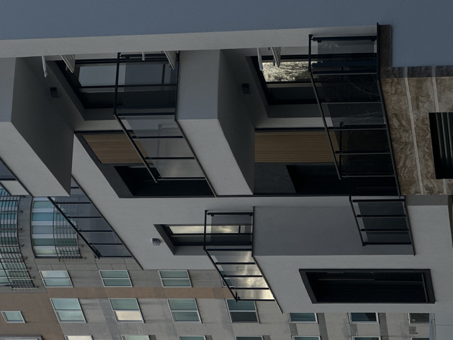 The image depicts an urban architectural scene in Dupnitsa, Bulgaria, focusing on a modern apartment building in the foreground with an older, multi-story building situated behind it. The primary structure on the right is a contemporary building featuring multiple cantilevered balconies with black metal frames and clear glass railings. Its facade is primarily white or light grey, contrasted with dark grey recessed sections and vertical wooden slat panels on some walls. Tall, dark-framed windows or sliding doors provide access to the balconies. A small wall-mounted light fixture is visible above one balcony door. The lowest visible section of this building incorporates a light brown or beige variegated stone cladding. Reflections of a cloudy sky are visible in the glass railings and windows, with tree branches also reflected in a lower window pane. Behind and to the left, a taller, older apartment building is visible. This structure has a beige or light brown exterior, showing signs of weathering. It features numerous rectangular windows with white frames arranged in a grid pattern. The upper left portion of this background building includes a distinct, rounded section with light blue glass panels and a balcony with metal railings. No individuals or active interactions are present in the scene. The lighting suggests overcast conditions or early morning/late evening.