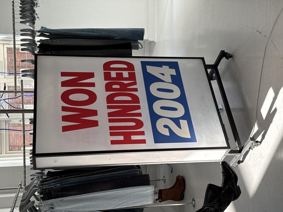 The scene is situated in Frederiksberg, Denmark. It depicts an indoor commercial space characterized by white walls and a reflective white floor. A prominent vertical light box display sign stands centrally on a black metal wheeled frame. The sign's white face exhibits "WON HUNDRED" in large red capital letters atop a blue rectangular field containing "2004" in large white numbers. Behind the sign, a metal clothing rail supports multiple denim garments, primarily trousers, on grey hangers. A window in the background reveals an exterior red-brick building. On the white floor, to the left of the sign, rests a pair of brown leather ankle boots. In the bottom-left corner, a person's left foot, encased in a black leather ankle boot, is positioned near the sign's base. Direct sunlight enters from the left, casting distinct shadows of the sign and the boot onto the floor. A thin white cable is visible on the floor extending from behind the sign.