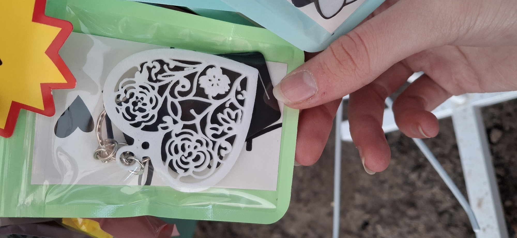 A hand is reaching for a green-bordered package that contains a white heart-shaped keychain with floral cutouts