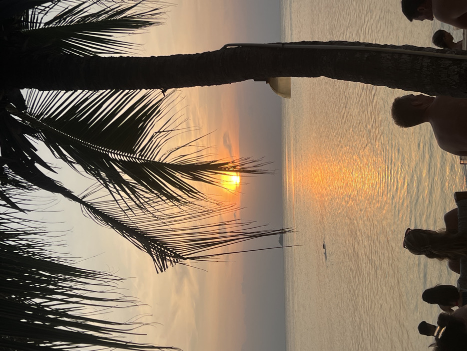 This image depicts a sunset over a body of water, likely a sea or ocean, in Baan Sri Thanu, Thailand. The sun, a bright orange sphere, is low on the horizon, casting a direct, shimmering golden reflection path across the calm water towards the foreground. The sky displays a gradient of warm orange and yellow directly above the horizon, transitioning to lighter, hazy blue-grey tones higher up. A small, dark landmass or island is visible on the horizon line in the mid-left. In the foreground, the backs of multiple individuals are visible in silhouette, facing the sunset. A woman with long hair and sunglasses positioned on her head is seated centrally. To her immediate right (viewer's left), a shirtless man with short hair is also visible from behind. Further right, partially obscured by a palm tree trunk, another shirtless man is present. Additional partial figures are visible on the far left and right edges of the frame, indicating a group observing the sunset. The scene is framed by two palm trees. Fronds from one palm tree extend into the upper-left quadrant. A thick palm tree trunk runs vertically along the right side of the image, with its fronds curving into the upper-right. A metallic-housed, bell-shaped lamp fixture is attached to the right palm tree trunk at mid-height. On the water's surface in the mid-left, a dark, elongated object or figure, possibly a swimmer or small boat, is visible.