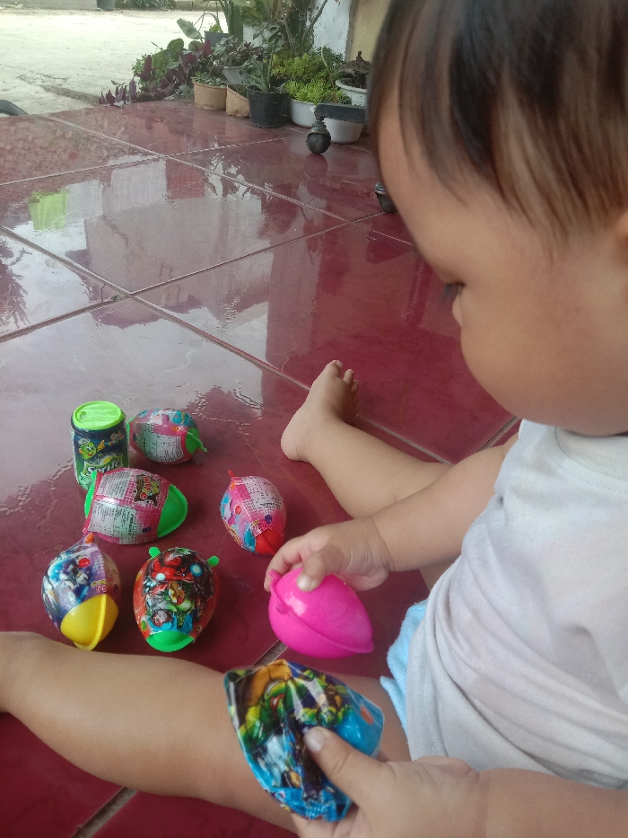 A young child, identified as an infant or toddler, is seated on a reflective, reddish-brown tiled floor in Ciherang, Indonesia. The child's upper body and legs are visible; they wear a white t-shirt and light blue lower garment. Dark hair is visible at the top of the frame. The child is actively engaged with multiple colorful toys. In the foreground, the right hand holds a closed, pink, oval-shaped toy, while the left hand manipulates an open, blue-patterned toy, revealing its interior. Seven additional toys are scattered on the tiled surface: one green can-shaped toy with a Sprite logo and six varied capsule-shaped toys, some wrapped in patterned paper, others with solid colored bases (yellow, green). The background consists of a light-colored outdoor concrete surface bordered by an assortment of potted plants and a small, dark decorative object. The tiled floor reflects ambient light and overhead structures.