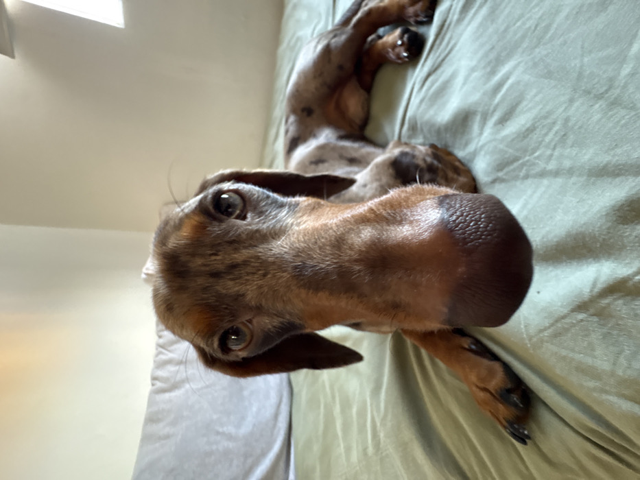 A close-up, wide-angle photograph depicts a dapple-patterned Dachshund lying prone on a bed
