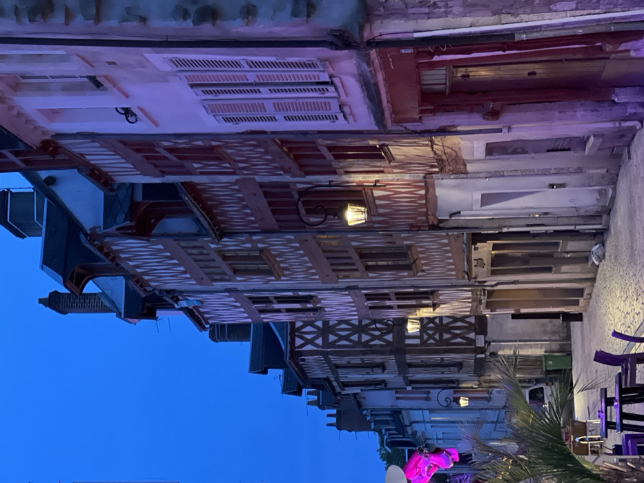 The image displays a narrow cobblestone street in Orléans, France, at twilight. The sky is a deep blue. On the immediate left foreground, outdoor seating consisting of dark tables and purple chairs is partially obscured by a large palm-like plant. Above the seating area, a bright pink, illuminated, abstract sculpture is visible. Further down the street on the left, a white vehicle is parked near two green trash bins. The right side of the street is lined with multi-story buildings featuring a mix of traditional half-timbered construction with reddish-brown beams and white infill, alongside structures with painted or stuccoed facades in shades of light pink, purple, and grey. Numerous windows, some with closed white or pale pink shutters, are present. Several traditional-style streetlights, emitting warm yellow light, are mounted on the building facades, illuminating parts of the street and structures. The buildings have pitched roofs and visible chimneys. The street appears empty of people.
