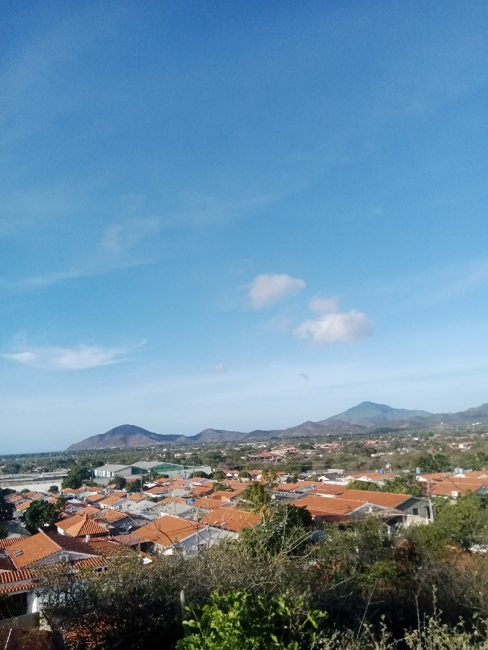 An elevated panoramic view captures a residential area in the city of Altagracia, Venezuela, under a bright, clear blue sky with sparse white clouds