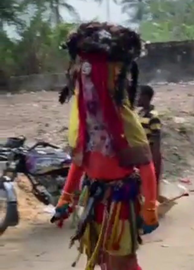 n elaborately costumed and masked person moving in what appears to be an outdoor, possibly rural or semi-rural, setting