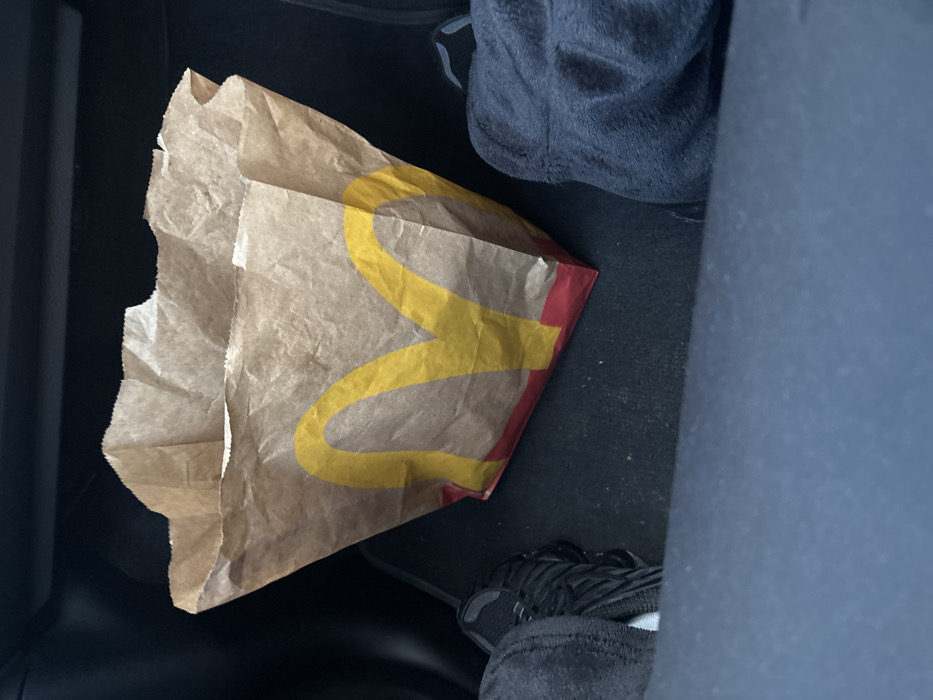 - "A McDonald's branded brown paper bag, featuring the yellow "M" logo and a red base, is centrally positioned on a dark, carpeted floor mat within a vehicle in Midrand, South Africa" by FM-EyE272, licensed under CC BY 4.0