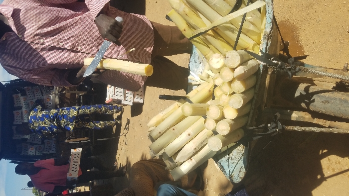 The scene depicts an outdoor market or roadside vendor stall in Bukuru, Nigeria, under bright daylight