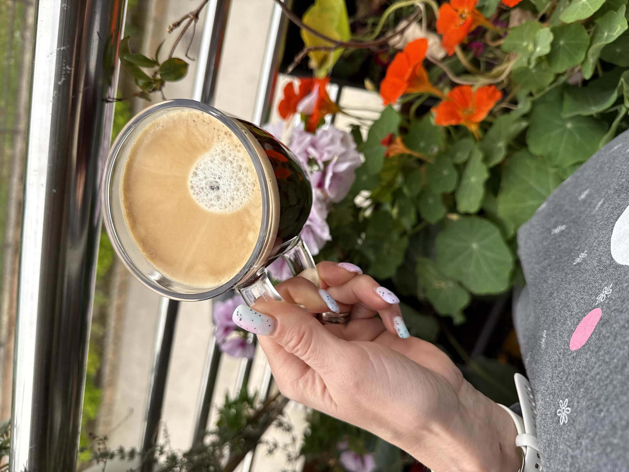 A woman holds a glass mug filled with a light brown coffee beverage featuring a layer of white foam on top. Her hand, adorned with pastel-colored nails with tiny black speckles, grasps the handle of the mug. The background shows a balcony railing, flowers in shades of orange and purple, and green foliage. A portion of the woman's gray sweater is visible on the right, along with a white wristwatch band. The environment suggests an outdoor cafe or residential balcony, potentially in Zelenika, Montenegro, but without further visual or contextual information, a definitive location cannot be established.