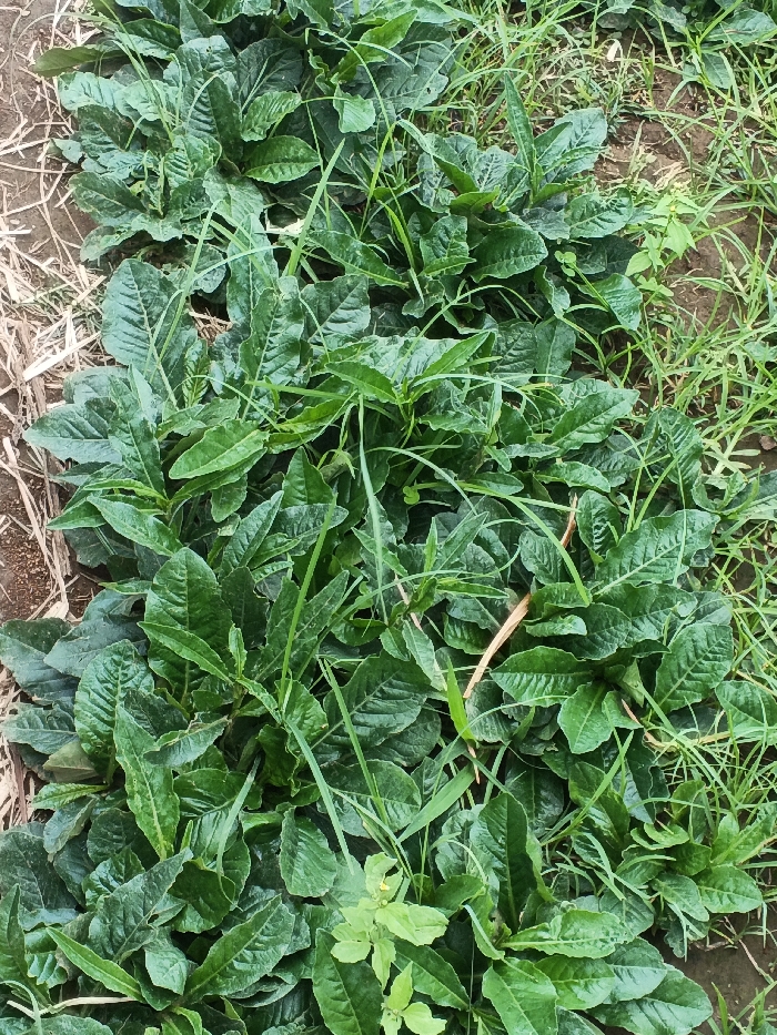 The scene displays an outdoor agricultural patch located in the city of Pinnwe, Myanmar (Burma). The image is dominated by a dense growth of dark green plants with broad, textured leaves, arranged in what appear to be cultivated rows or distinct clusters. Thin-bladed, lighter green grass and other small herbaceous plants are interspersed throughout the primary vegetation and along the right margin. Exposed dark brown soil is visible between plant clusters and along the left side, where it is partially covered by light brown, dried plant matter resembling straw. No human or animal subjects, nor any man-made objects, are present in the frame.