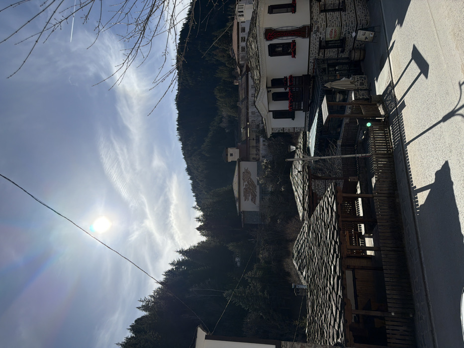 The image presents a daytime street view in Shiroka Laka, Bulgaria, under a bright, partly cloudy sky