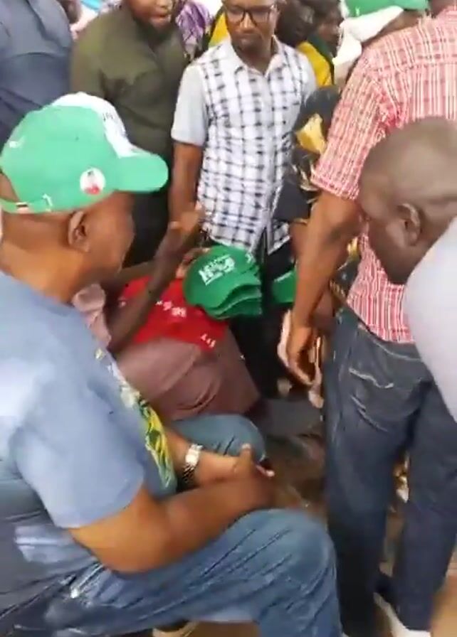 A group of men stand outside, surrounding two seated individuals. One seated individual wears a blue shirt, jeans, and a green and white baseball cap. They sit with their hands clasped in their lap. The other seated individual wears a red shirt. An individual standing in front of the seated ones holds a stack of green and white baseball caps. The men in the group wear various clothing, including a red and white plaid shirt, a blue shirt, and a black and white checkered shirt. The surroundings appear to be outdoors, possibly in a wooded area.