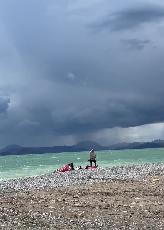 A person is preparing a kiteboarding setup on a rocky beach under a dramatic, cloudy sky. The person stands near the edge of the turquoise-colored water, next to a red kite and a kiteboard. There are mountains in the distance, partially obscured by the weather. The sky is filled with dark, looming clouds, suggesting an approaching storm.