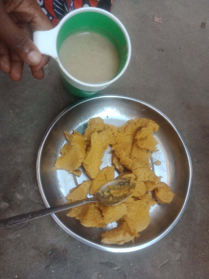 The image depicts a meal served on a coarse, grey ground surface in Hotoro North, Nigeria. In the upper left, a dark-skinned hand holds a white and green plastic mug containing a light brown, opaque liquid. A round, silver-colored metal plate rests on the ground, filled with numerous irregular pieces of a yellowish-orange, crumbly food item. A silver-colored metal spoon, with some food residue, lies across the food on the plate.