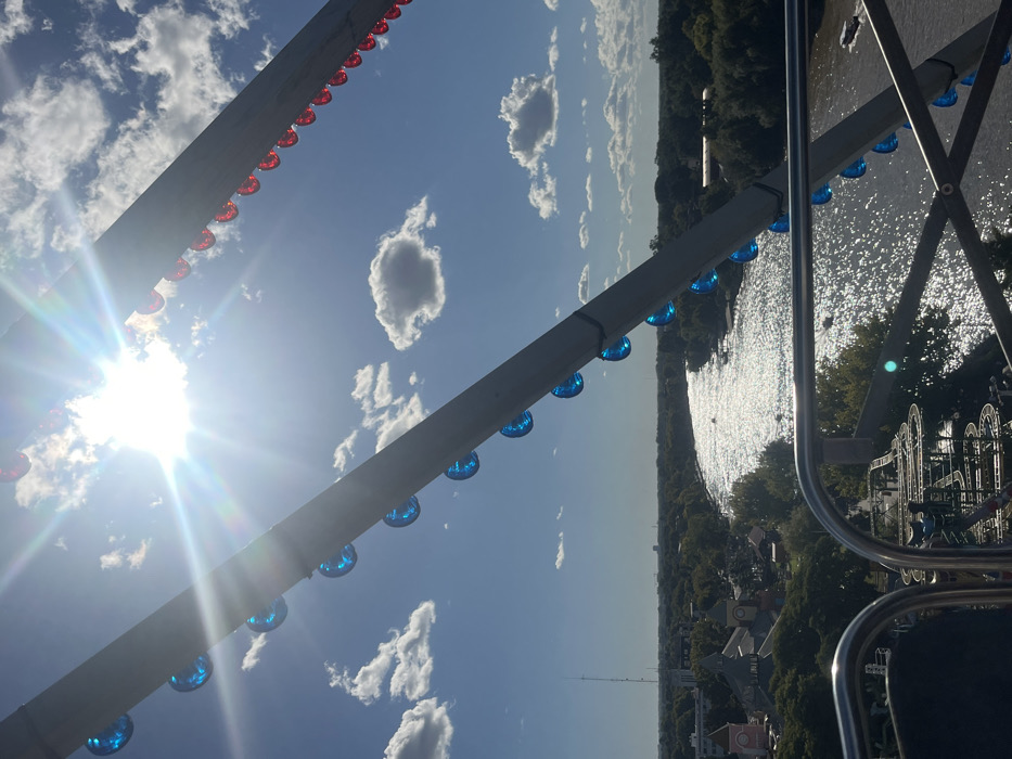 This image presents an elevated daytime view from a Ferris wheel in Tigre, Argentina, looking over the Paraná River delta area. The scene is dominated by a clear blue sky with scattered white cumulus clouds. A bright sun, positioned in the upper-left quadrant, creates prominent sunbeams and lens flare. In the immediate foreground, diagonal metal support beams of the Ferris wheel are visible. The left beam features a series of evenly spaced circular blue lights, while the right beam displays a series of red circular lights. The curved metal framework of a passenger gondola is partially visible in the lower-left corner. Below the left beam, a segment of a roller coaster track with multiple twists and turns is discernible. The midground features a wide river, likely a branch of the Paraná, flowing horizontally across the frame. Its surface intensely reflects sunlight, appearing bright and shimmering. Several indistinct small watercraft are visible on the river. Both riverbanks are densely lined with mature green trees and foliage. On the left riverbank, an amusement park is visible, characterized by various buildings with pointed roofs and towers, hinting at an entertainment complex. A tall, slender communication tower or mast stands out on the left side. The distant horizon reveals a flat landscape with faint outlines of urban structures, suggesting a further populated area. No specific individuals or their actions are clearly identifiable in the scene.